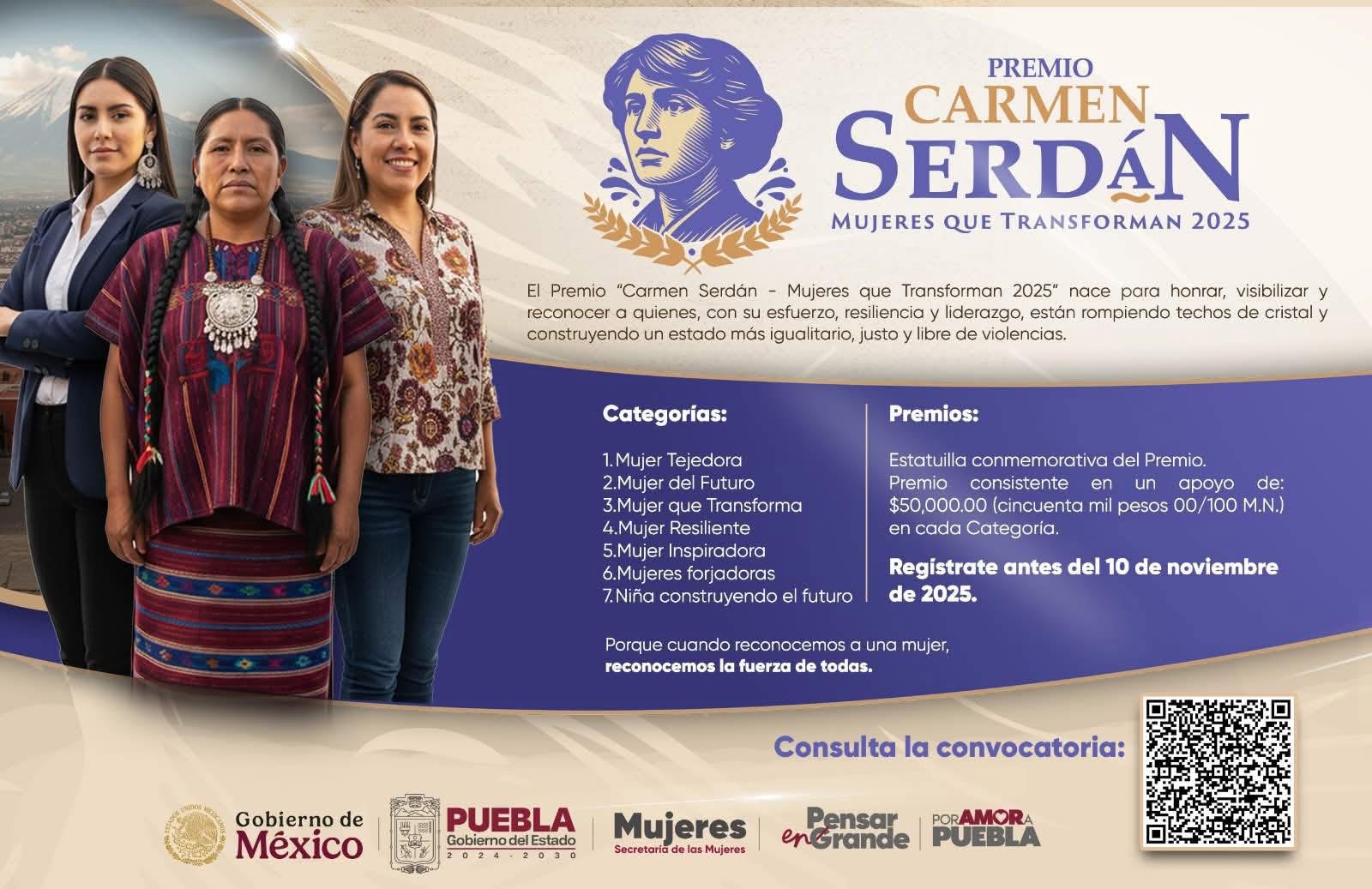 El Gobierno del Estado de Puebla, a través de la Secretaría de las Mujeres, anunció la apertura de la convocatoria para participar en el Premio Carmen Serdán 2025, un galardón que busca reconocer a aquellas mujeres que, con su esfuerzo, resiliencia, compromiso y liderazgo, están contribuyendo a la construcción de un estado más igualitario, justo y libre de violencias.