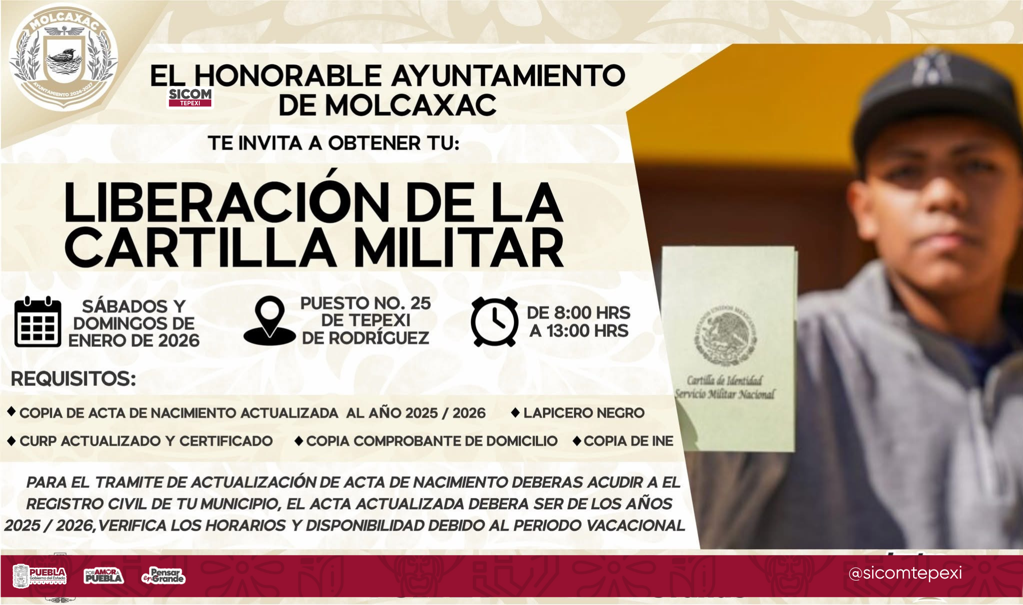La Junta Municipal de Reclutamiento de Tepexi de Rodríguez dio a conocer que la liberación de la Cartilla del Servicio Militar Nacional se llevará a cabo durante los sábados y domingos del mes de enero de 2026, en el Puesto No. 25, ubicado en este municipio.