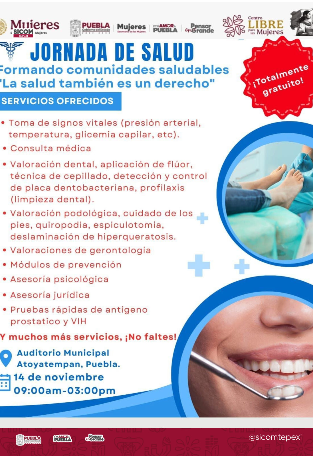 Con el compromiso de impulsar el bienestar integral y la prevención en la población, el próximo 14 de noviembre se llevará a cabo la Jornada de Salud “Formando comunidades saludables, la salud también es un derecho”, en el Auditorio Municipal de Atoyatempan, en un horario de 9:00 a.m. a 3:00 p.m.