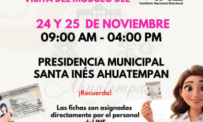 SANTA INÉS AHUATEMPAN, PUE. 24 de noviembre El H. Ayuntamiento dio a conocer que los días lunes 24 y martes 25 de noviembre el módulo itinerante...