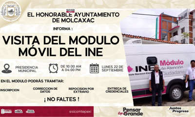 Molcaxac Pue. 21 de septiembre 2025 El Honorable Ayuntamiento de Molcaxac informó que este lunes 22 de septiembre se instalará el Módulo Móvil del Instituto Nacional...