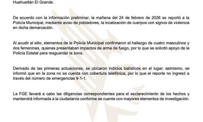 Huehuetlan El Grande, 24 de Febrero 2026 La fiscalía General Del Estado de Puebla informó que inició una carpeta de investigación tras el hallazgo de seis...