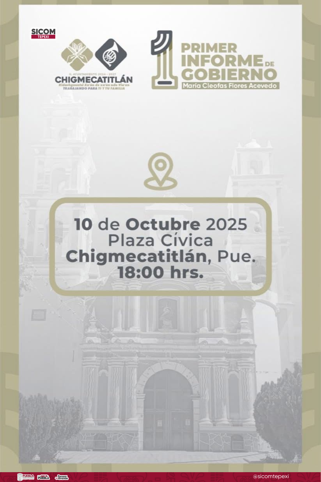 El Honorable Ayuntamiento Municipal de Chigmecatitlán, encabezado por la C. María Cleofas Flores Acevedo, llevará a cabo el Primer Ejercicio de Rendición de Cuentas: “Primer Informe de Gobierno 2025”, con el propósito de dar a conocer las acciones y resultados obtenidos durante el primer año de la administración 2024–2027.