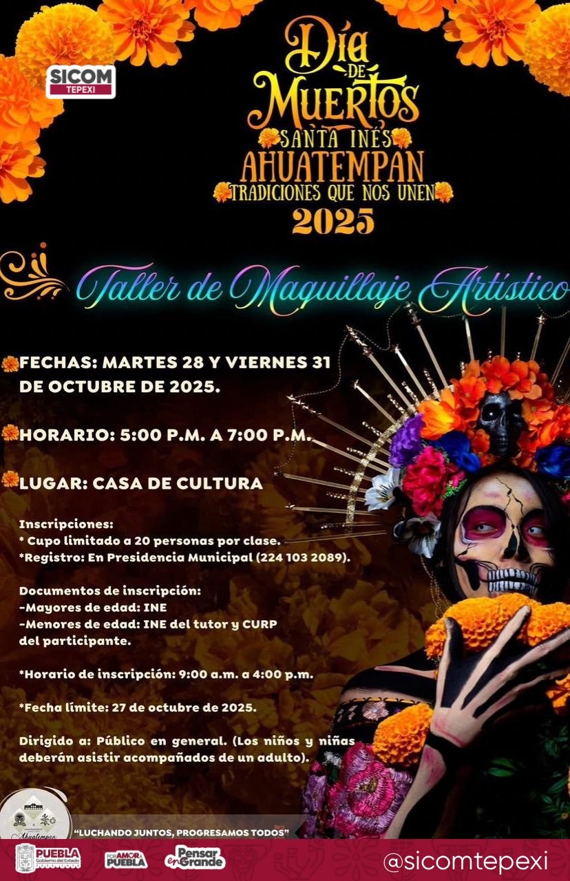 En el marco de las celebraciones por el Día de Muertos 2025, el H. Ayuntamiento de Santa Inés Ahuatempan invita a la población en general a participar en el Taller de Maquillaje Artístico, una actividad que busca fortalecer las tradiciones mexicanas a través del arte y la creatividad.