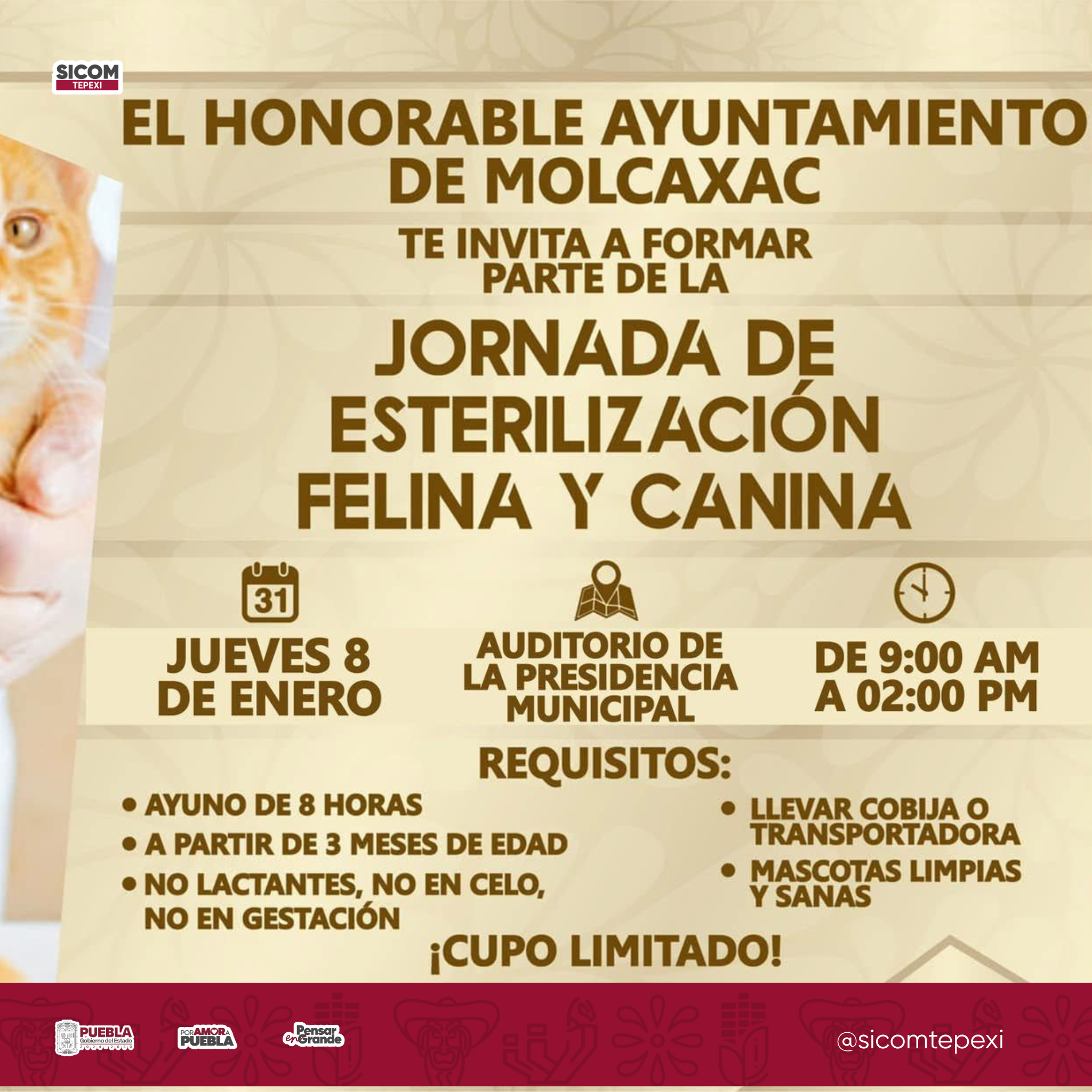 Con el objetivo de promover el bienestar animal, la salud pública y una tenencia responsable de mascotas, el Honorable Ayuntamiento de Molcaxac convocó a la ciudadanía a participar en la Jornada de Esterilización Felina y Canina, la cual se llevó a cabo el jueves 8 de enero en el Auditorio de la Presidencia Municipal, en un horario de 9:00 de la mañana a 2:00 de la tarde.