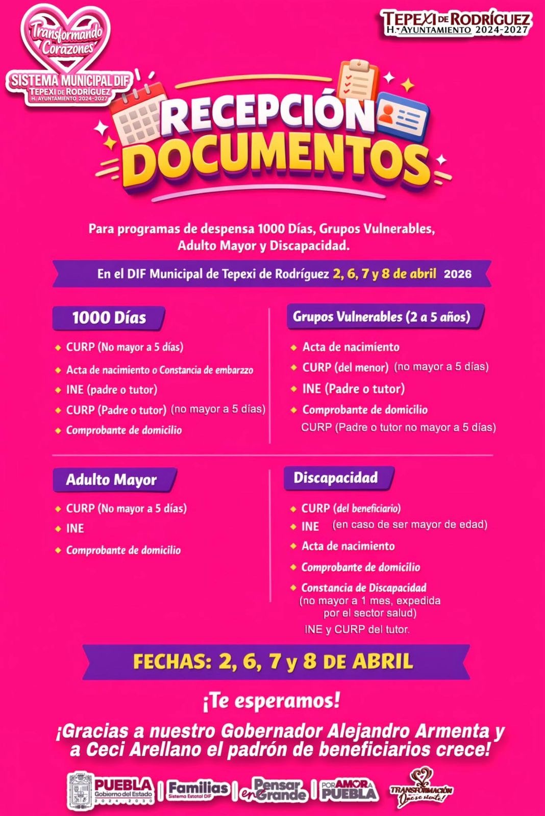El Sistema DIF Municipal de Tepexi de Rodríguez dio inicio a la recepción de documentos para integrarse a diversos programas de apoyo alimentario, dirigidos a sectores prioritarios de la población.