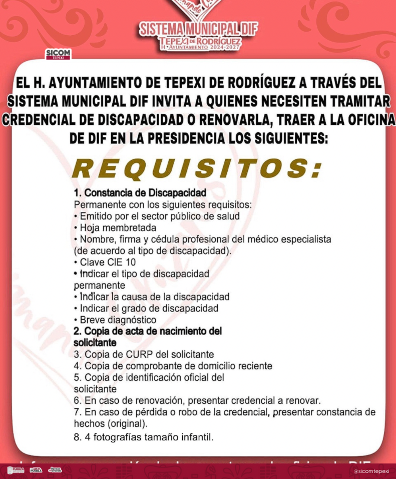 El H. Ayuntamiento de Tepexi de Rodríguez, a través del Sistema Municipal DIF, invita a todas las personas que necesiten tramitar o renovar su credencial de discapacidad a acudir a la oficina del DIF, ubicada en la Presidencia Municipal.