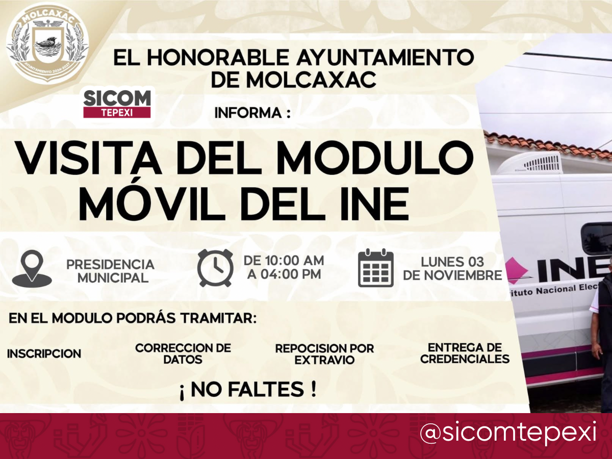 El próximo lunes 3 de noviembre, el Módulo Móvil del Instituto Nacional Electoral (INE) visitará la cabecera municipal de Molcaxac, con el propósito de brindar atención directa a la ciudadanía que necesite realizar trámites relacionados con su credencial para votar.