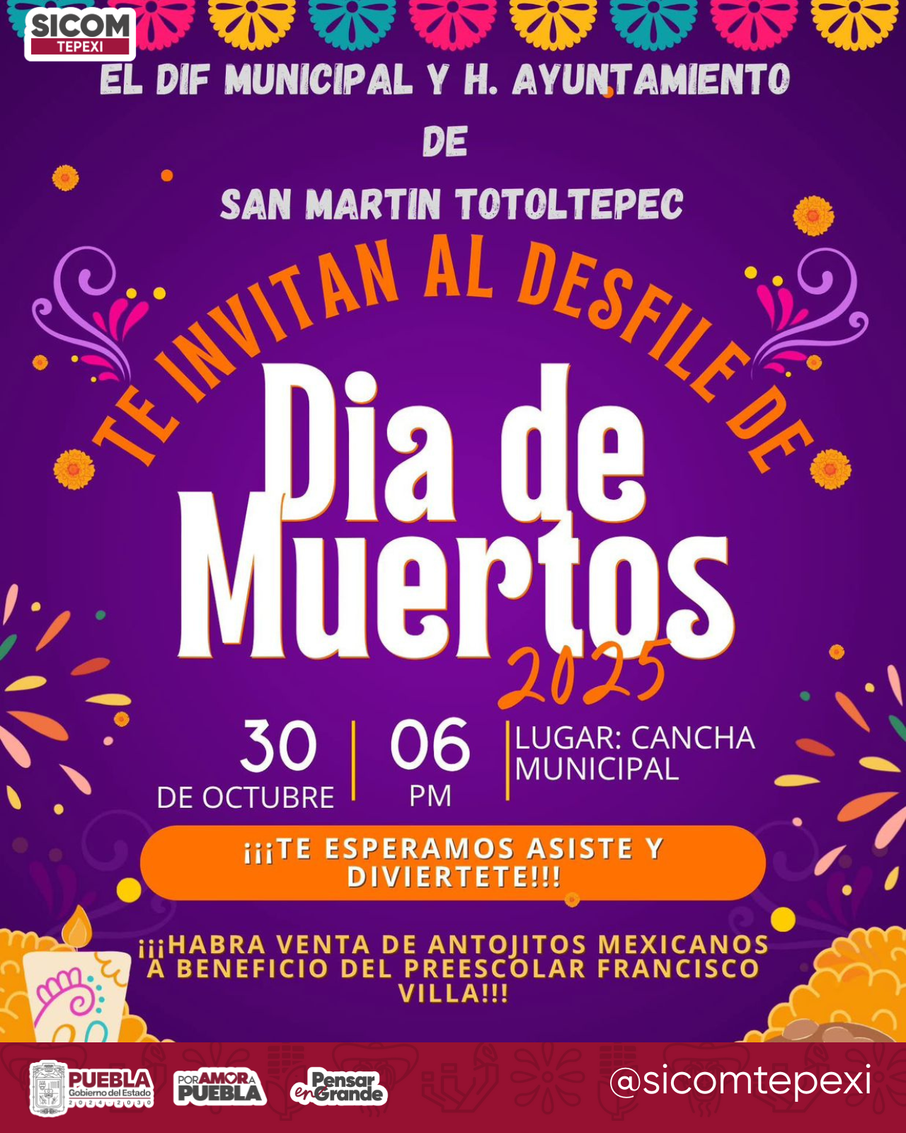 Con el propósito de preservar las costumbres mexicanas y fortalecer los lazos comunitarios, el DIF Municipal y el H. Ayuntamiento de San Martín Totoltepec anunciaron la realización del Desfile de Día de Muertos 2025, que se llevará a cabo el jueves 30 de octubre a las 6:00 p.m. en la cancha municipal.