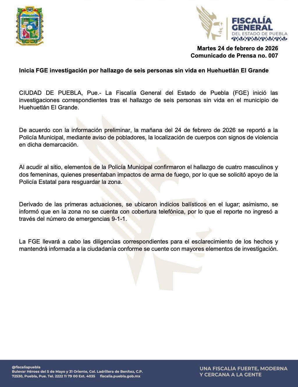 La fiscalía General Del Estado de Puebla informó que inició una carpeta de investigación tras el hallazgo de seis personas sin vida en el municipio de Huehuetlán El Grande.