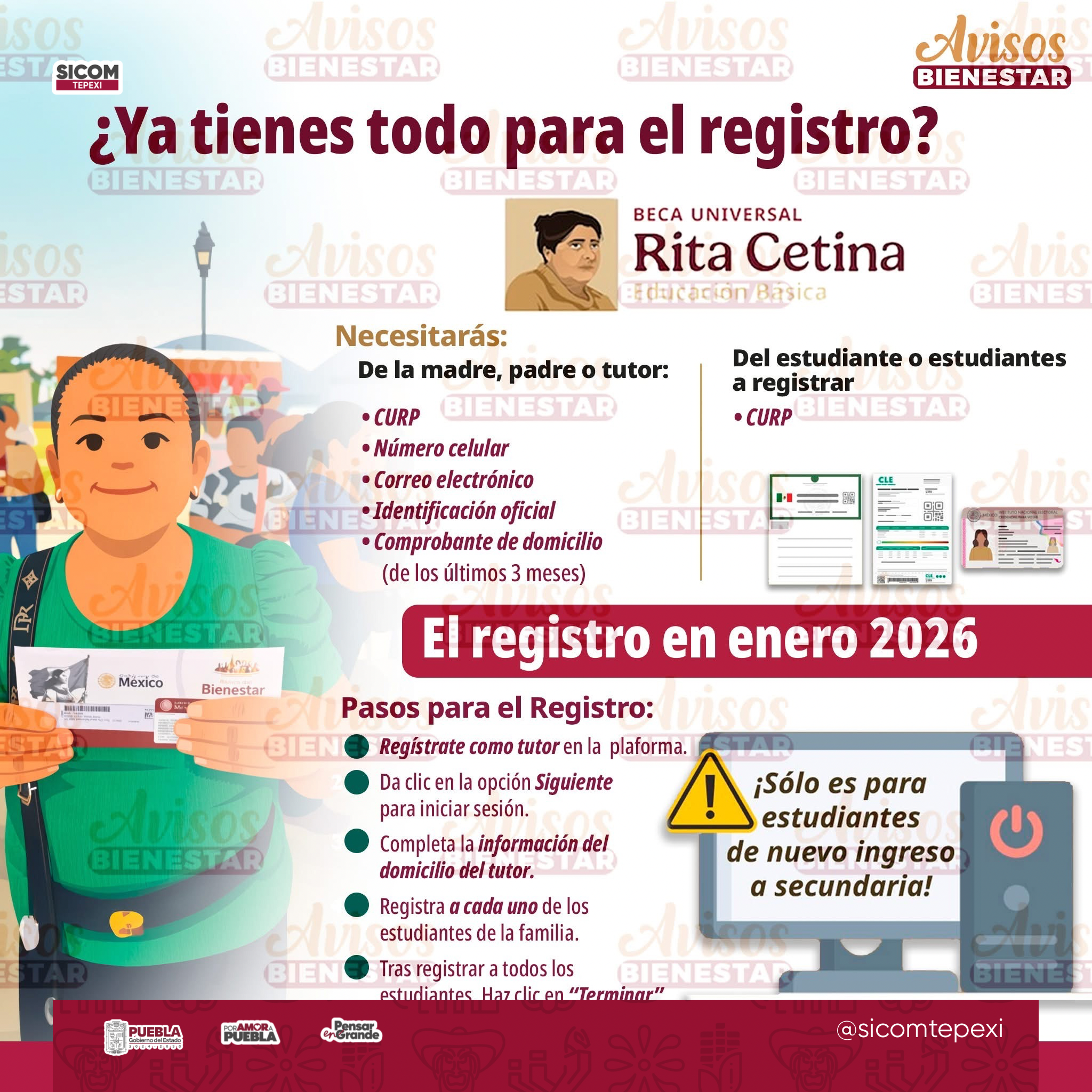 Con el propósito de brindar información clara y oportuna a las familias, se dio a conocer que el registro para la Beca Universal Rita Cetina, dirigida a estudiantes que cursan 4°, 5° y 6° de nivel Primaria, dará inicio en el mes de enero de 2026, de acuerdo con lo informado por las autoridades educativas competentes.