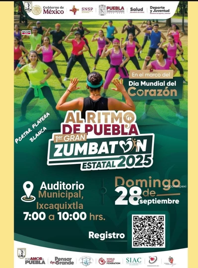 En el marco del Día Mundial del Corazón, la Regiduría de Salubridad y Asistencia Pública convoca a la ciudadanía a participar en el Zumbatón Estatal 2025, que se realizará el próximo domingo 28 de septiembre en el auditorio municipal, en un horario de 7:00 a 10:00 de la mañana.