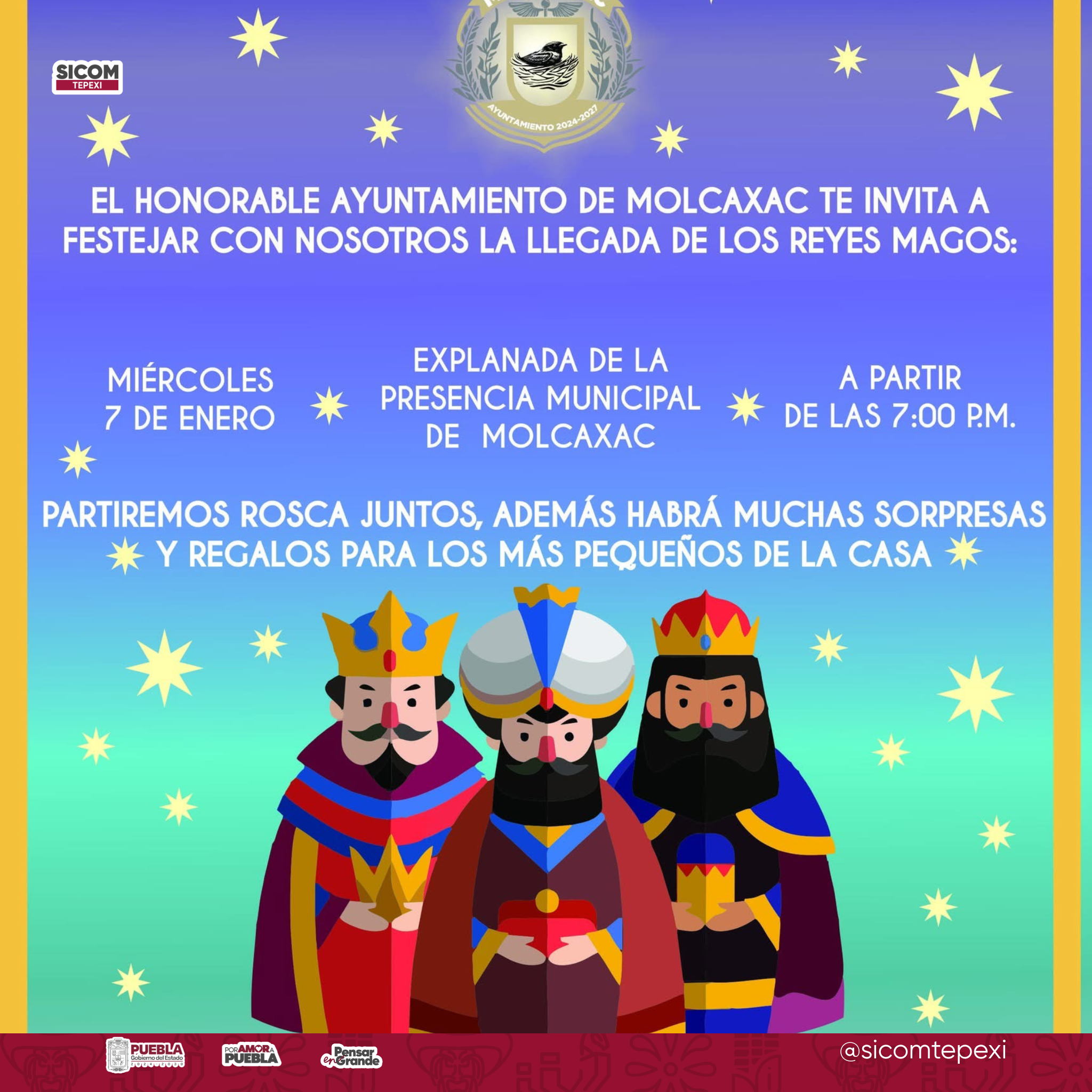Con el propósito de fortalecer la convivencia familiar y preservar las tradiciones que forman parte de la identidad cultural del municipio, el Honorable Ayuntamiento de Molcaxac 2024–2027 invita a la ciudadanía a participar en la celebración de la tradicional llegada de los Reyes Magos, una festividad que año con año llena de ilusión y alegría a niñas, niños y familias enteras.