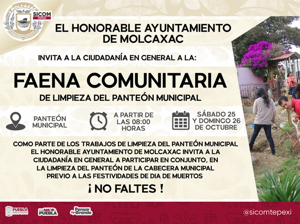 En el marco de las próximas festividades de Día de Muertos, el H. Ayuntamiento de Molcaxac invita a todas y todos los habitantes del municipio a participar en una faena comunitaria que se realizará en el Panteón Municipal los días sábado 25 y domingo 26 de octubre, a partir de las 8:00 de la mañana.