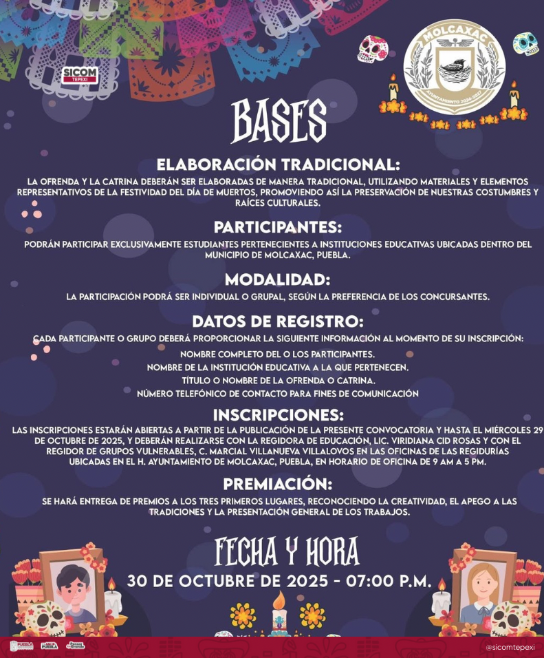 El H. Ayuntamiento de Molcaxac, a través de la Regiduría de Educación, encabezada por la C. Viridiana Cid Rosas, y la Regiduría de Grupos Vulnerables, a cargo del C. Marcial Villanueva Villalovos, invita a todas las instituciones educativas del municipio a participar en el Concurso de Ofrendas y Catrinas 2025, en el marco de las festividades del Día de Muertos.
