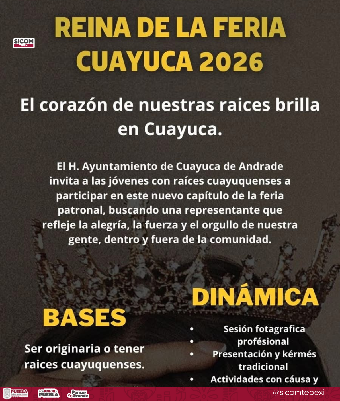 El H. Ayuntamiento de Cuayuca de Andrade anunció la apertura oficial de inscripciones para participar en la elección de la Reina de la Feria Cuayuca 2026, uno de los eventos más representativos y esperados dentro de las festividades patronales del municipio. La convocatoria, emitida este 21 de noviembre, busca fortalecer el sentido de pertenencia, promover las tradiciones locales y dar visibilidad al talento y carisma de las jóvenes cuayyuquenses.