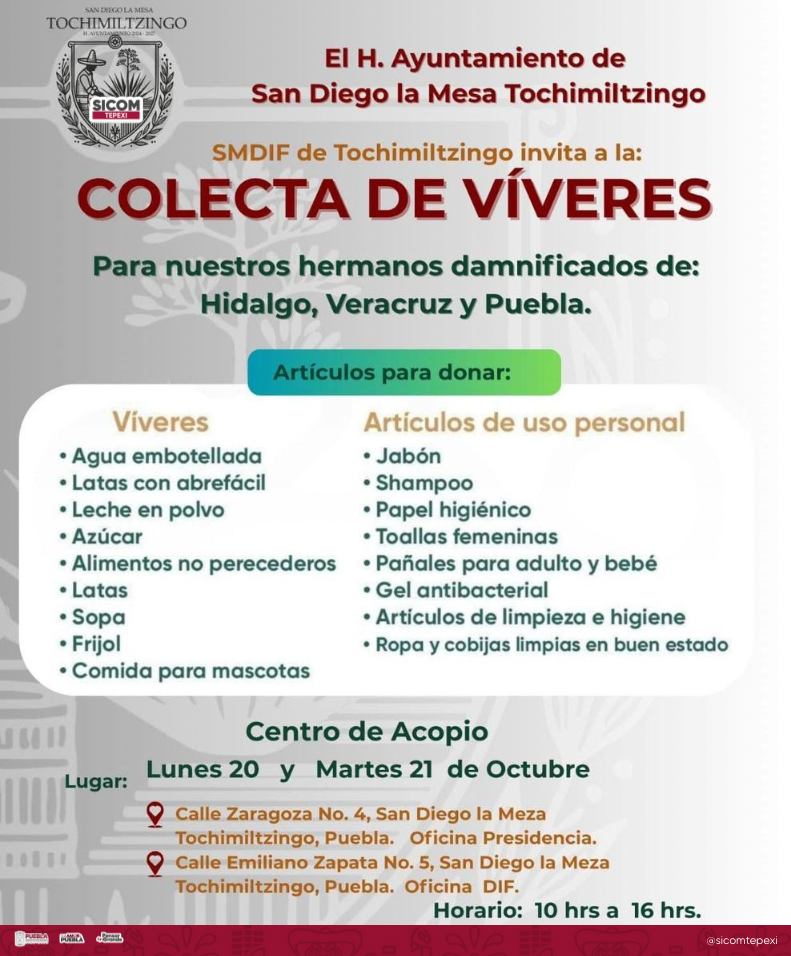 Ante las fuertes lluvias atípicas que han afectado a diversas regiones de los estados de Veracruz, Hidalgo y Puebla, el H. Ayuntamiento de San Diego la Mesa Tochimiltzingo hace un llamado solidario a toda la población para sumarse a la colecta de víveres en apoyo a las familias damnificadas de la Sierra Norte.
