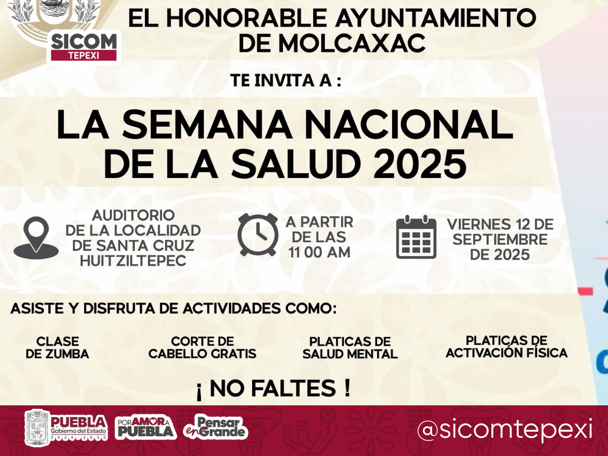 El H. Ayuntamiento de Molcaxac, en coordinación con la Regiduría de Grupos Vulnerables encabezada por el C. Marcial Villanueva Villalobos, anunció la realización de la Semana de la Salud en la localidad de Santa Cruz Huitziltepec, este viernes 12 de septiembre de 2025 a partir de las 11:00 horas, teniendo como sede el Auditorio de la comunidad.