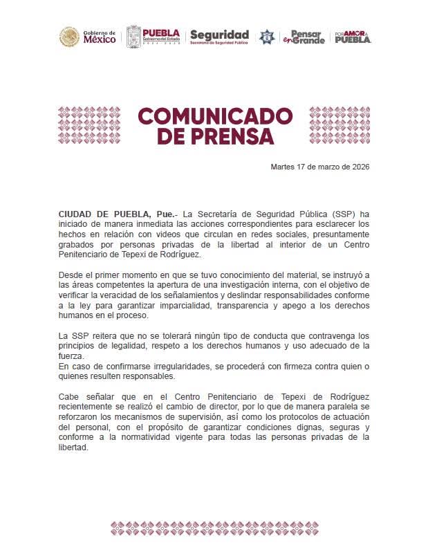 La Secretaría de Seguridad Pública del Estado de Puebla (SSP) informó que inició una investigación interna luego de la difusión de videos en redes sociales, presuntamente grabados por personas privadas de la libertad al interior del Centro Penitenciario de Tepexi de Rodríguez.