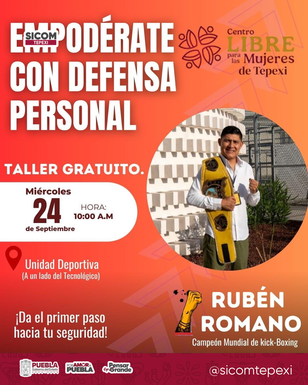 El Centro Libre para las Mujeres de Tepexi invita a todas las mujeres a participar en el taller “Empodérate con defensa personal”, que se llevará a cabo el próximo miércoles 24 de septiembre a las 10:00 de la mañana en la Unidad Deportiva, ubicada a un lado del Tecnológico.