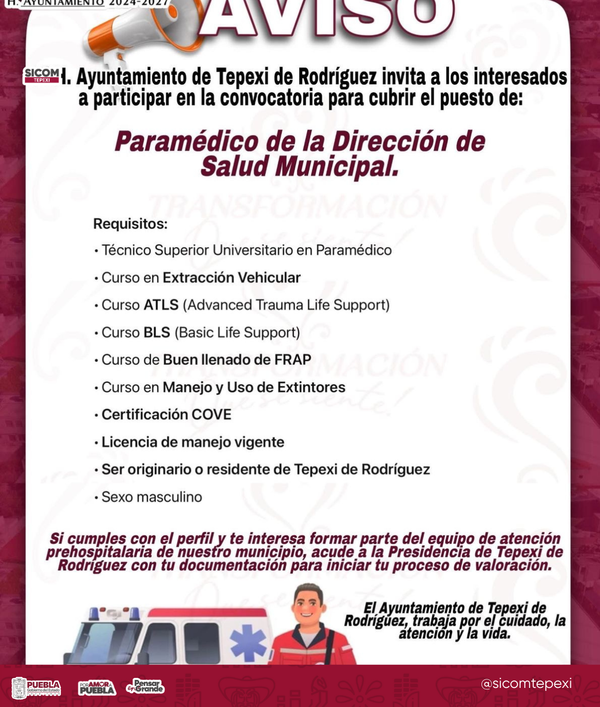 El H. Ayuntamiento de Tepexi de Rodríguez dio a conocer la apertura de la convocatoria para ocupar el puesto de Paramédico en la Dirección de Salud Municipal, con el propósito de fortalecer los servicios de atención prehospitalaria y brindar una respuesta oportuna ante emergencias médicas en beneficio de la población tepexana.