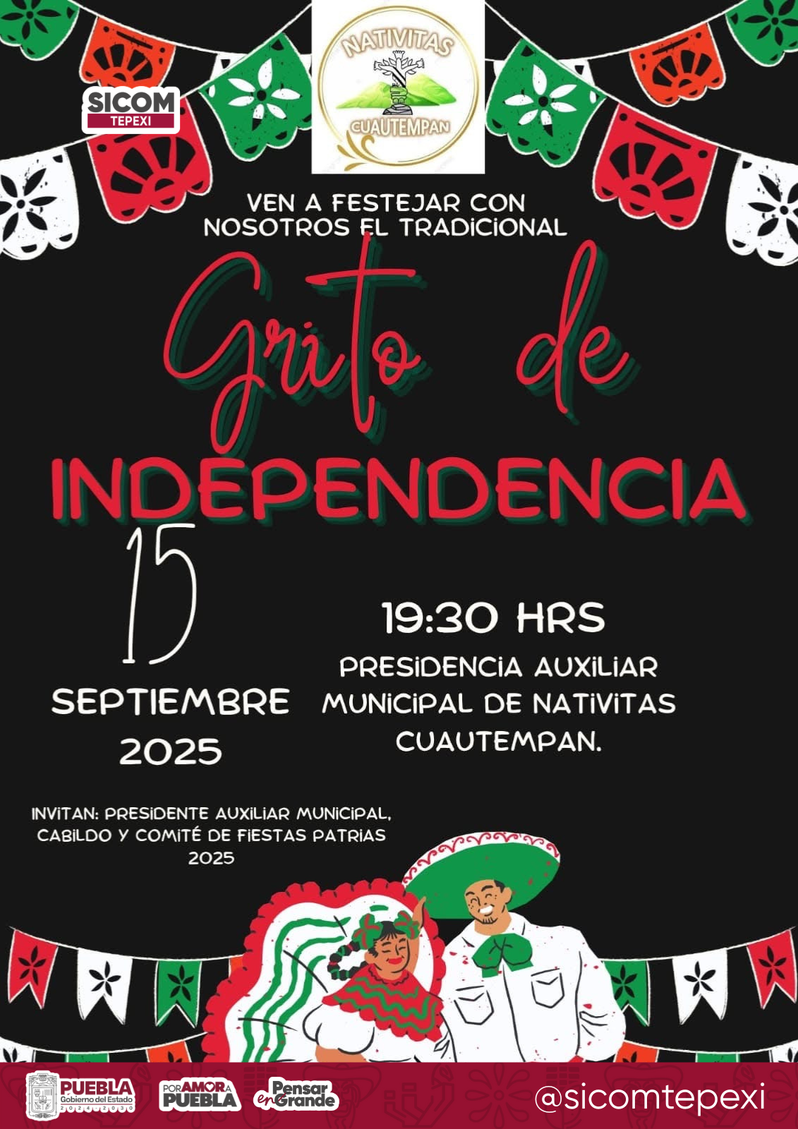 El Ayuntamiento de Tepexi de Rodríguez, que encabeza el presidente municipal Humberto Bolaños Del Rosario, llevará a cabo este 15 de septiembre la celebración de las Fiestas Patrias 2025 en la explanada municipal.