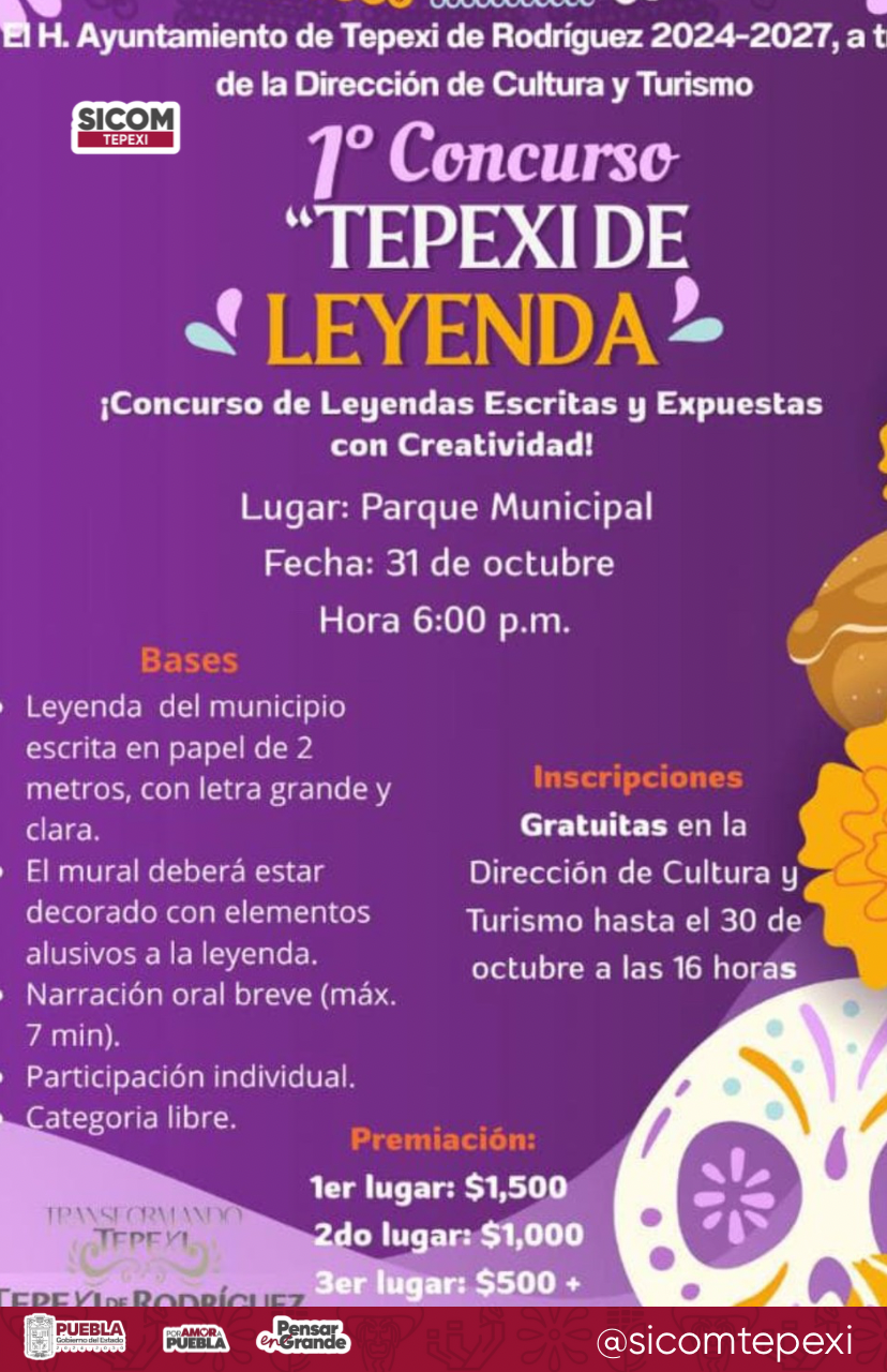 Con el propósito de preservar las tradiciones orales y fortalecer la identidad cultural del municipio, el H. Ayuntamiento de Tepexi de Rodríguez 2024–2027, a través de la Dirección de Cultura y Turismo, lanzó la convocatoria para el Primer Concurso “Tepexi de Leyenda”.