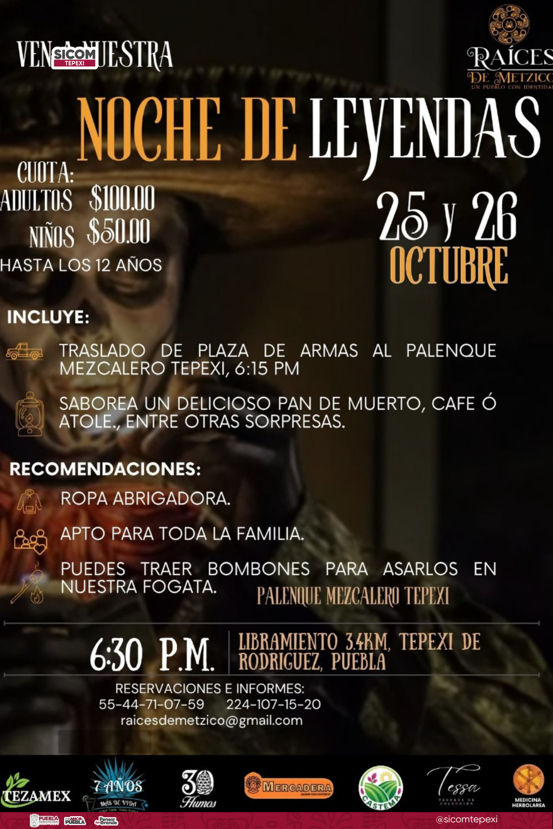 Los días 25 y 26 de octubre, a partir de las 6:30 P.M., se llevará a cabo la “Noche de Leyendas”, una actividad ideal para disfrutar en familia en el Palenque Mezcalero Tepexi, ubicado en el Libramiento Km 3.4.