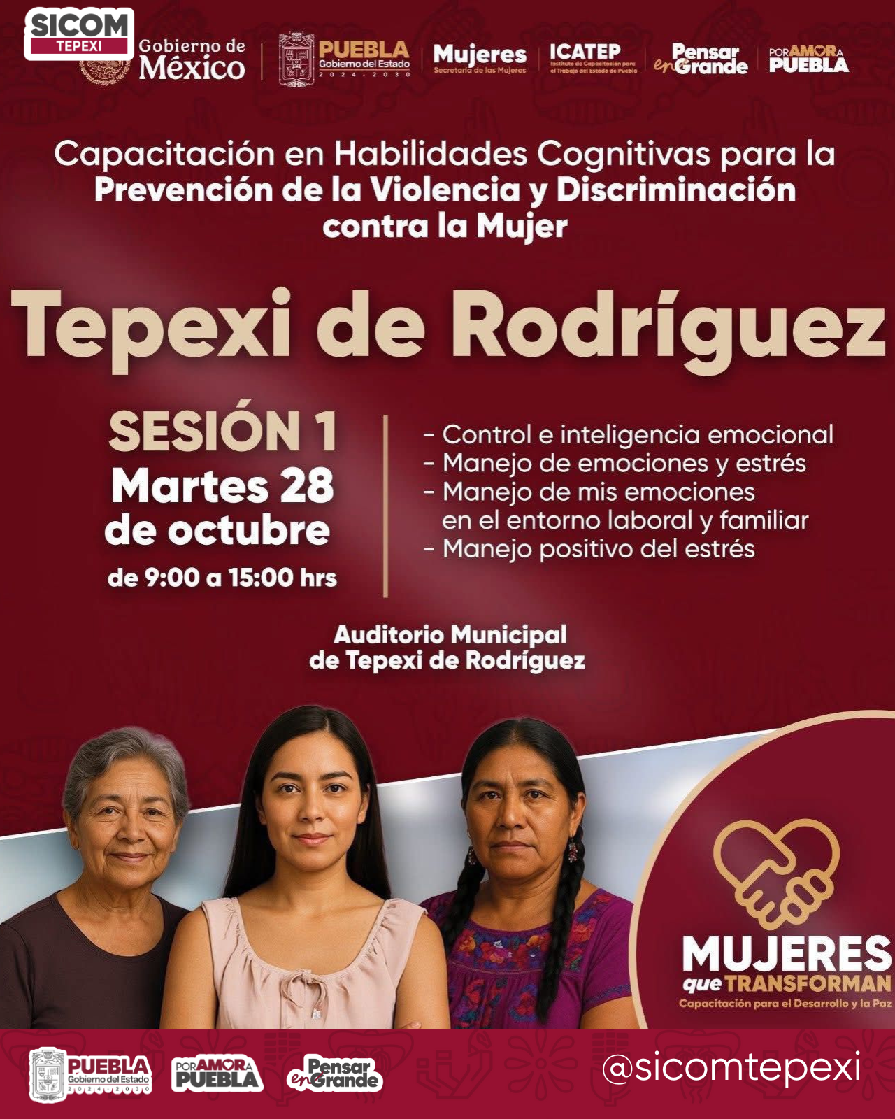Tepexi de Rodríguez, Pue.– Con el compromiso de promover entornos más seguros, equitativos y libres de violencia, el Instituto Municipal de la Mujer de Tepexi de Rodríguez, en coordinación con el Instituto de Capacitación para el Trabajo del Estado de Puebla (ICATEP) y la Secretaría de Igualdad Sustantiva, puso en marcha la Capacitación en Habilidades Cognitivas para la Prevención de la Violencia y la Discriminación contra la Mujer.