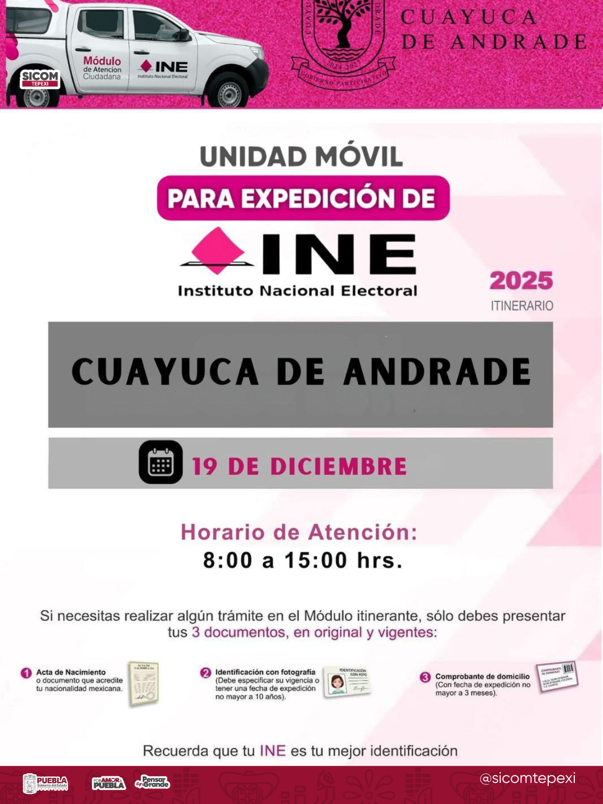 El H. Ayuntamiento de Cuayuca de Andrade informó que el 19 de diciembre el municipio recibirá la visita de la Unidad Móvil del Instituto Nacional Electoral (INE), con el propósito de acercar los servicios de identificación oficial a la población que requiere expedir, renovar o actualizar su credencial para votar.